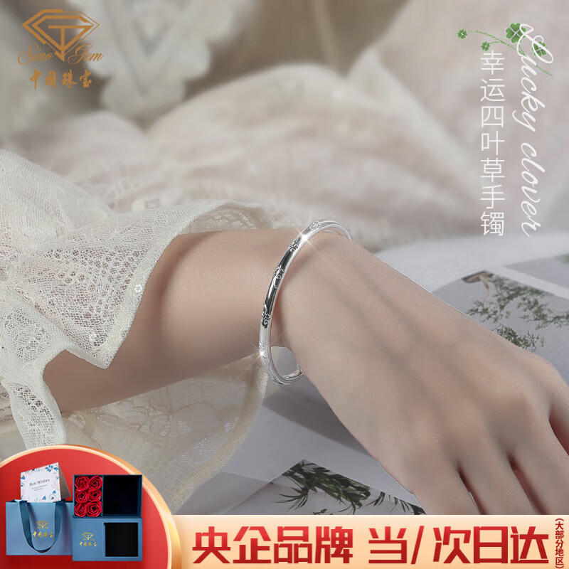 包邮 中国珠宝生日礼物送女友四叶草银手镯足银999银镯子银饰约20g